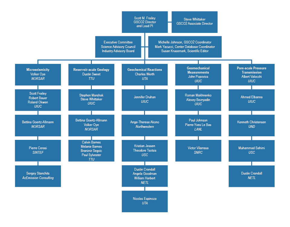 The GSCO2 is supported by a Center Coordinator, Scientific Editor, and Database Coordinator. Two advisory committees, the Science Advisory Council (SAC) and Industry Advisory Board (IAB), review the Center annually for direct advice and counsel to the Director, Associate Director, and Theme Leaders.